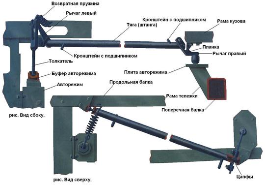 Под нагрузкой кузов вагона проседает по отношении к раме тележки. Правый рычаг, поднимаясь вверх, проворачивает штангу авторежима против часовой стрелки. Левый рычаг опускается вниз, воздействуя через толкатель на буфер авторежима.