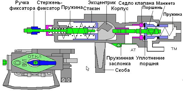 Механический узел включает в себя эксцентрик, жёстко связанный со скобой двумя болтами, а так же стакан с возвратными пружинами и стержень-фиксатор с пружинами и ручкой.
