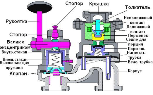 Для автоматического отключения ТД при срабатывании срывного клапана, а также ручного отключения срывного клапана от ТМ. Состоит из корпуса, в котором имеется седло для клапана две трубки нагнетательная и всасывающая. К корпусу крепятся электрическая и механическая части.