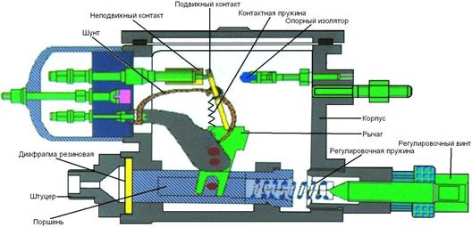 А) Электрическая часть включает в себя поршень, нагруженный пружиной снизу, который является клапаном, выше него имеется отверстие в седле клапана, ведущее под текстолитовый поршенёк. Этот поршенёк взаимодействует с подвижным лепестковым контактом и толкателем, рядом находятся неподвижные контакты, к которым подводятся провода (33) из схемы управления.