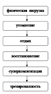 После выполнения физической нагрузки в организме начинаются реакции восстановления. При этом следует уточнить, что в интервале отдыха происходит, скорее, не восстановление функций к исходному уровню, а их переход к новому состоянию. Восстановление израсходованных во время работы ресурсов происходит не до исходного уровня, а с некоторым излишком. Это называется суперкомпенсацией. Именно вследствие суперкомпенсации израсходованных ресурсов возрастает тренированность (схема 2).
