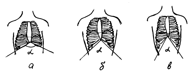 Различают следующие формы грудной клетки: коническую (надчревный угол больше прямого), цилиндрическую (надчревный угол прямой), уплощенную (надчревный угол меньше прямого).