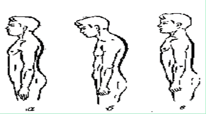 При неправильной осанке голова слегка наклонена вперед, спина сутулая, грудь плоская, живот выпячен.