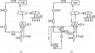 а — конденсационной; 6 — теплоэлектроцентрали; ТПВ — трубопровод питательной воды; ПК — паровой котел; Т — турбина; Г — генератор; К — конденсатор; Э — эжектор; ТЦВ — трубопровод циркуляционной воды; ЦН — циркулярный насос; КН — конденсатный насос; В — водоподогреватель; ПН, ПН1, ПН2 — питательные насосы; ВБ — водяная батарея; ПБ — паровая батарея