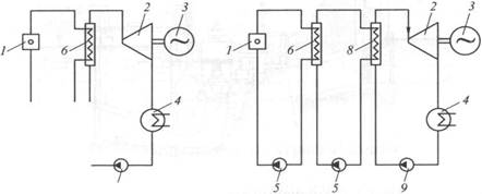 1 — реактор; 2 — турбина; 3 — генератор; 4— конденсатор; 5 — циркуляционный насос; 6 — парогенератор; 1,9— топливный насос; 8 — теплообменник