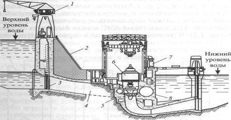 1 — кран для подъема водозапорных щитов; 2 — плотина; 3 — генератор; 4 — повышающий трансформатор; 5 — отсасывающая труба; 6 — спиральная камера; 7 – рабочее колесо гидротурбины; 8 — водозапорный щит.