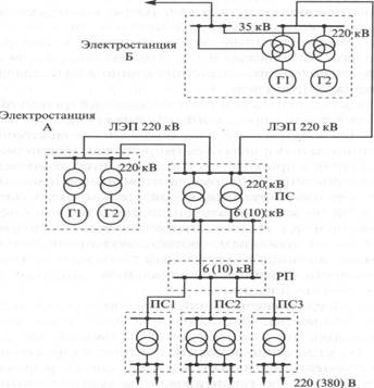 Принципиальная схема передачи и распределения электрической энергии показана на рис. 1.5. Электрическая энергия, вырабатываемая генераторами с номинальным напряжением 10...15 кВ, поступает в трансформаторы электростанции А, где ее напряжение повышается до 220 кВ, после чего она подается на сборные шины открытой подстанции этой электростанции, а затем при помощи ЛЭП 220 кВ передается на шины 220 кВ понижающей подстанции, связанной также ЛЭП 220 кВ с электростанцией Б.