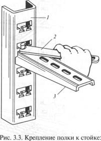 Стойки могут быть высотой 400, 600, 800, 1200 и 1800 мм с числом овальных отверстий для установки полок соответственно 8, 12, 16, 24 и 36. Длина полок 160, 250, 350 и 450 мм.