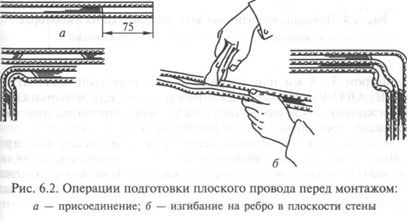 У плоских проводов с разделительным основанием при изгибе их на ребро (при повороте трассы на 90°) в месте изгиба вырезают основание на длине 40...60 мм (рис. 6.2).