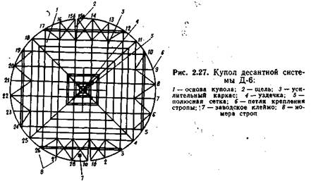 ОСНОВНОЙ КУПОЛ: предназначен для безопасного снижения и приземления парашютиста. Имеет форму двадцативосьми угольника из капронового полотна. Площадь купола 83 м2. Стропы 1 и 28 окрашены в зеленый цвет или помечены зелеными шлевками, также стропа 14 отмечена красным цветом для укладки. Длина строп 9 метров. На нижней кромке купола, слева от строп, указаны их порядковые номера. Между стропами 28 и 1 стоит заводское клеймо.