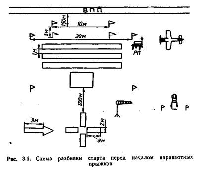 Аэродромом называется земельный участок, специально оборудованный для обеспечения взлета, посадки, стоянки, обслуживания летательных аппаратов. Аэродром, с целью определения рабочей части, должен иметь ограничительные знаки, обозначающие ВПП (взлетно-посадочная полоса) и РД (рулевая дорожка). Рядом с местом приземления самолета, левее ВПП выкладывается посадочное Т. летом - белое, зимой - черное. Впереди и сзади «Т», из таких же полотнищ выкладываются ограничители. Из полотнищ выкладывается и «крест» - место точного приземления парашютистов. РД, места стоянки самолетов и технических средств на старте, место расположения людей обозначаются флажками и указателями.