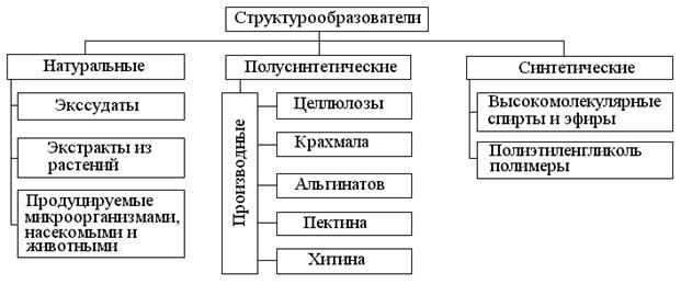 Натуральные структурообразователи – это, как правило, вещества (кроме желатина, хитина и некоторых др.) растительного или микробиологического происхождения. К экссудатам[1] относят смолы, выделяемые растениями: гумиарабик, смола гатти, смола карая. Экстракты, получаемые из морских водорослей, представлены агаром, агароидом, алъгинатами, каррагеном, фурцеллараном. К студнеобразователям, получаемым из зерен и плодов растений, относят крахмалы (из пшеницы, кукурузы, картофеля и др. растений), порошки из семян семейства бобовых, гуар, тара, арабикогалактан, пектины. К гидроколлоидам продуцируемым микроорганизмами относят декстран, ксантан, кулдран, геллан, политран и др.