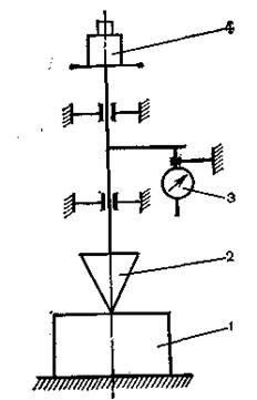 Исследуемая масса помещается в сосуд (рис. 15) на подъемный столик, вершина конуса 2 приводится в соприкосновение с поверхностью массы. Конус нагружается гирями 4, и с помощью индикатора 3 определяется величина погружения конуса до полной его остановки.