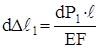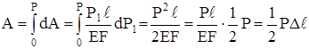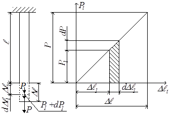 Внешняя сила Pt растёт от нуля до конечного значения Р. Соответственно и деформация ∆ℓt растёт от нуля до конечного значения ∆ℓ. Пусть некоторой растягивающей силе P1 соответствует деформация ∆ℓ1. Дадим силе бесконечно малое приращение dP1, при этом деформация получит приращение d∆ℓ1. Очевидно, работа внешней силы на этом перемещении