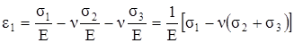 Поскольку направление σ1 для самого напряжения σ1 является продольным, а для напряжений σ2 и σ3 – поперечным, то по формулам (3.24) находим