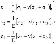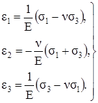 Выражения (3.25) справедливы не только для главных деформаций, но и для относительных линейных деформаций по любым трём взаимно перпендикулярным направлениям, поскольку при малых деформациях влияние сдвига от действия касательных напряжений на линейную деформацию представляет собой величину второго порядка малости. Иными словами, индексы «1», «2» и «3» могут быть заменены на индексы х, у и z.