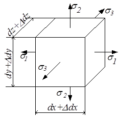 Установим связь между относительным изменением объёма элементарного параллелепипеда и главными напряжениями. До деформации размеры сторон были dx, dy и dz (рис.3.14,а). После деформации эти размеры стали dx + ∆dx, dy + ∆dy и dz + ∆dz (рис.3.14,б).