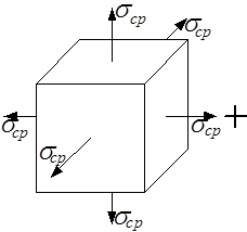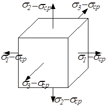 Для определения этих составляющих заданное напряжённое состояние представим в виде суммы двух напряжённых состояний (рис.3.15): изменяющего объём элементарного кубика (гидростатическое растяжение одинаковыми средними напряжениями) и изменяющего форму кубика.