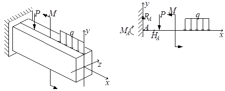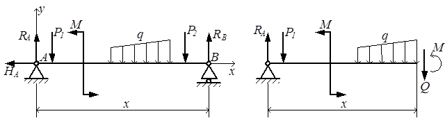 На расчётной схеме балку заменяют её осью (рис.5.1,б). При этом все нагрузки, естественно, должны быть приведены к оси балки, и силовая плоскость будет совпадать с плоскостью чертежа. Все реальные внешние нагрузки могут быть приведены на расчётной схеме к трём типам: сосредоточенной силе P (размерность – кН), сосредоточенному моменту М (размерность – кН×м) и распределённой нагрузке интенсивностью q (размерность – кH/м). Причем распределённая нагрузка может быть равномерной или постоянной (рис.5.1,б), а может изменяться по линейному закону (гидростатическое давление) или по любому, более сложному закону. Нагрузки, действующие на балку, относятся к внешним силам. К ним относятся также реакции опор. На рис. 5.1,б это RA, HA и MA. Реакции зависят от конструкции опор.