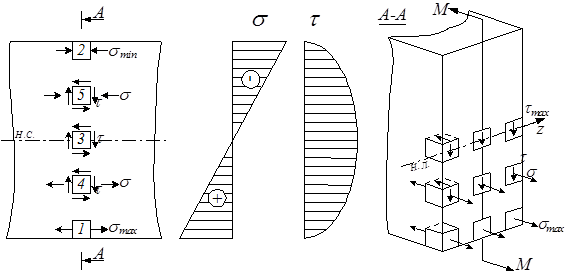 Пусть в поперечном сечении произвольной балки действуют положительная поперечная сила Q и изгибающий момент M. На рис. 5.25,б и 5.25,в показаны графики σ и τ по высоте массивного сечения, а на рис. 5.25,а изображен фасад балки и напряженное состояние в ряде точек по высоте балки. Одна из граней элементарных кубиков совпадает с поперечным сечением. На рис.5.25,г показано сечение А-А и выделенные в нём элементы. Элементы 1 и 2 выделены у крайних точек сечения. Здесь τ = 0, σ = σmax или σ = σmin.