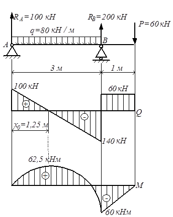 Помним, что момент M равен площади предшествующей эпюры Q. На шарнирной опоре A: M = 0. Далее при движении от опоры A вправо при положительной Q момент возрастает и в точке, где Q пересекает ноль, M = Mmax = площади треугольника на эпюре Q. Один катет треугольника известен 100 кH, второй – х0 = Q/q = 100/80 = 1,25 м, Mmax = ½ ∙ 100 ∙ 1,25 = 62,5 кН ∙ м. Затем момент уменьшается на площадь отрицательного треугольника: Mmax = 62,5 – ½ ∙ 140 ∙ 1,75 = – 60 кН ∙ м. Далее момент возрастает на площадь положительного прямоугольника: М = –60+60 ∙ 1=0. Действительно, в сечении около силы P момент должен быть равен нулю. Эпюра M построена.