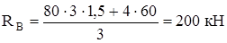 å y = 0: RA – q ∙ 3 + RB – P = 0, RB = 80 ∙ 3 – 200 + 60 = 100 кН.