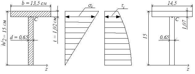 Итак, принимаем двутавр № 30а; прочность балки лимитируется не наибольшим нормальным напряжением и не наибольшим касательным напряжением, а напряжённым состоянием в точке перехода от полки к стенке.