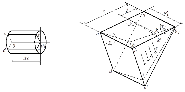 Из стержня, показанного на рис. 7.3, вырежем участок длиной dx (рис. 7.4,а), а из него – сектор abcdoo1. Далее покажем деформацию этого сектора (рис. 7.4,б).