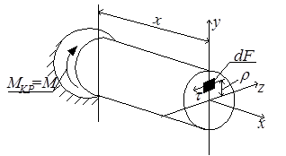 Формула (7.6) показывает, что касательные напряжения в поперечном сечении изменяются по линейному закону прямо пропорционально расстоянию ρ точек от центра сечения. Очевидно, максимальные напряжения будут у поверхности стержня при ρ = r. Нам пока неизвестен относительный угол закручивания θ. Для определения его необходимо рассмотреть статическую сторону задачи (рис. 7.5).