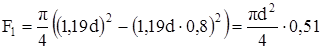 В качестве примера решим задачу о соотношении площадей поперечного сечения равнопрочных трубчатого и сплошного валов, приняв α = 0,8. Прочность характеризуется моментом сопротивления, поэтому 0,2d3 = 0,2d3H (1 – α4).