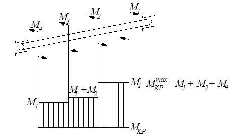 По схеме вала определяются действующие на него скручивающие моменты по формуле (7.1) и строится эпюра крутящего момента Mкр. Пример такой эпюры приведён на рис. 7.2. Наибольший скручивающий момент М3 (момент на “ведущем шкиве”) приложен в середине вала. Другой вариант эпюры крутящих моментов, когда “ведущий шкив” расположен на краю вала, - на рис. 7.7