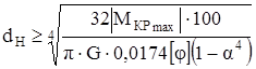 Учитывая выражение (7.12) для полярного момента инерции Jp, принимая l=1м=100 см и переводя [φ] из градусов/метр в радианы/метр, находим наружный диаметр вала из условия жёсткости