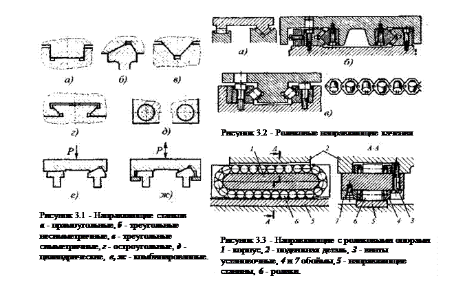 - направляющие качения. В зависимости от формы тел качения: роликовые (рис.3.2, 3.3) и шариковые (редко в виду плохой несущей способности).