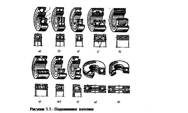 Подшипники качения в большинстве случаев состоят из наружного 4 (рис. 3.7, а) и внутреннего 1 колец с дорожками качения, тел качения 3 (шариков или роликов), сепаратора 2, разделяющего и направляющего тела качения. В некоторых подшипниках одно или оба кольца могут отсутствовать. В них тела качения обкатываются непосредственно по канавкам (цапфам) вала или корпуса.