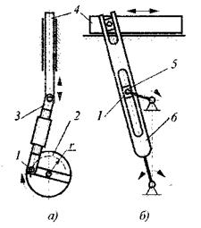 Кривошипно-кулисный механизм (рис. 3.26, б) содержит, кроме ведущего кривошипа 1 и ведомого ползуна 4, камень 5, перемещающийся в направляющем пазу кулисы 6. При вращении кривошипа кулиса качается, а ползун движется возвратно-поступательно. Кривошипно-кулисный механизм отличается большой быстроходностью, достаточно плавным реверсированием, но скорость рабочего хода неравномерна, а при уменьшении скорости рабочего хода уменьшается и скорость холостого хода.