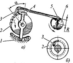 Храповые механизмы могут быть с наружным и внутренним зацеплением. Вмеханизме с наружным зацеплением (рис. 3.27, а) собачке 3 сообщается качательное движение. При движении против часовой стрелки собачка через зубья храпового колеса 2 поворачивает его на некоторый угол. При обратном ходе собачка, проскальзывая по зубьям храпового колеса, не вращает его. Качательное движение собачка 3 получает через шатун от ведущего кривошипного диска 6 с пальцем 5. Изменение положения пальца 5 в пазу (т.е. изменение радиуса R) позволяет регулировать угол поворота a собачки 3. Другим способом изменять угол поворота храпового колеса при неизменном положении кривошипного пальца 5 можно щитком 4, который закрывает часть зубьев храпового колеса, и собачка в начальный период рабочего движения скользит по его поверхности, а затем сходит с него, попадая на зуб храпового колеса, и поворачивает его. Щиток в выбранном положении удерживает фиксатор 1.