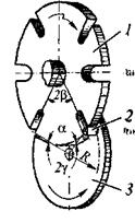 Мальтийские механизмы применяют для того, чтобы периодически поворачивать на определённый угол 2b ведомое звено - многопазовый диск ("мальтийский крест") 1 (рис. 3.28) при равномерном повороте ведущего звена - кривошипного диска 3. За часть оборота кривошипного диска 3 (угол 2a), когда происходит поворот диска 1, кривошипный палец (цевка) 2 вводится в радиальный паз и выводится из него. В момент вывода пальца из одного паза следующий паз оказывается в положении, при котором палец может быть снова введён в него. Для смягчения удара палец должен входить в паз в строго радиальном направлении. На угол 2g кривошип поворачивается вхолостую. Если у кривошипного диска 3 два пальца, то за один его оборот многопазовый диск 1 поворачивается дважды, каждый раз на угол 2b.