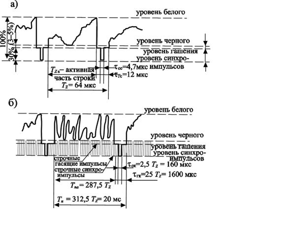 Сигнал, состоящий из видео, гасящих и синхронизирующих импульсов, называется полным телевизионным сигналом (рисунок 1.7 а). Таким образом, телевизионный сигнал может быть характеризован уровнями и длительностями синхронизирующих и гасящих импульсов, частотой повторения строк и кадров, а также уровнями и частотным спектром видеосигнала.