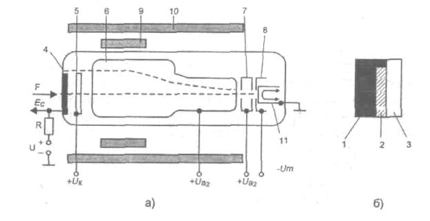 Рис. 3.4. Видикон: а – устройство преобразователя; б – состав фотомишени; 1 – планшайба; 2 – сигнальная пластина; 3 – фотопроводящий слой; 4 фотомишень; 5 – коллектор; 6 – второй анод; 7 – первый анод; 8 – управляющий электрод; 9 – отклоняющая катушка;