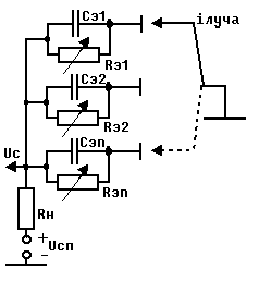 На рис. 3.5 представлена эквивалентная схема фотомишени видикона, которая поясняет процесс образования видеосигнала. На этой схеме каждый элемент фотомишени представлен емкостью конденсатора Сэ, образованного элементами сигнальной пластины и правой стороны мишени, который зашунтирован резистором Rэ, изменяющий свое сопротивление в зависимости от интенсивности освещенности этого участка. При отсутствии освещения фотослой имеет высокое – «темновое» сопротивление. При освещении мишени за счет поглощения энергии излучения внутри фотослоя возникают носители тока. При проекции изображения на мишень, сопротивления Rэ оказываются различными. Возникает рельеф сопротивлений. При коммутации пучком медленных электронов потенциал правой стороны мишени устанавливается равным потенциалу катода = 0 (заземлен). Тогда под действием тока луча емкости заряжаются до потенциала сигнальной пластины. Между двумя коммутациями (период кадра) происходит разряд емкостей через элементарные сопротивления, а так как эти сопротивления разные (чем выше освещенность, тем меньше сопротивление), ток разряда будет тоже изменяться (меньше сопротивление – больше ток), и за это время оставшийся заряд на емкостях будет разный (больший ток – сильнее разрядиться емкость – меньше потенциал останется). Таким образом, рельеф сопротивлений преобразуется в потенциальный рельеф. Сигнал изображения образуется при последовательном прохождении участков мишени электронным лучом, выравнивающим рельеф, при этом на неосвещенных участках ток будет почти равен 0, т.к. здесь сопротивление было большим, значит, разряда почти не произошло, и от луча электроны отбираться не будут. А на ярких участках, где произошел почти полный разряд, луч потеряет большое количество электронов, т.е. ток заряда будет большим.