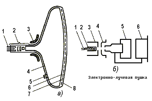 Конструктивно кинескоп состоит из 3 основных частей: стеклянной колба - 8, электронно-оптической системы - 2, формирующей электронный луч, и люминофорного экрана – 7.