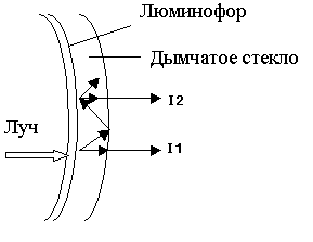 Существенно снижает контраст мелких и средних деталей явление ореола,который образуется вследствие того, что часть расходящихся световых лучей, пройдя сквозь толщу стекла экрана (рис.4.2), на границе стекло-воздух отражается обратно, освещая соседние участки. В результате яркая точка экрана оказывается окруженной менее ярким кольцом - ореолом, что и является причиной снижения контраста. Для борьбы с этим явлением экран современного кинескопа изготавливают из специального стекла, являющегося нейтральным фильтром – дымчатого, контрастного, противоореольного, которое повышает контраст мелких деталей примерно в 15 раз.