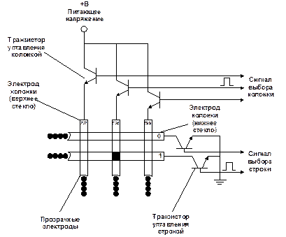 Ширина проводников соответствует размерам одного элемента изображения. Пространственное пересечение горизонтального и вертикального проводников создают потенциальный пиксель. Каждый вертикальный проводник может быть подключен к корпусу через транзистор, а горизонтальные проводники так же через транзисторы подключены к источнику питающего напряжения (1400 транзисторов 800+600). Транзисторы управляются видеопроцессором, входящим в состав дисплея.
