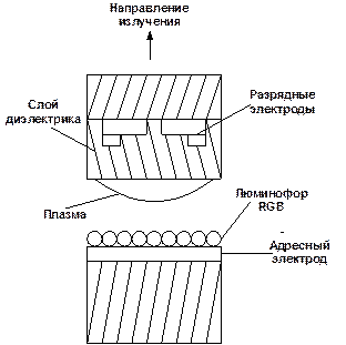На рисунке 4.9показана трехэлектродная структура ячейки. Третий электрод - адресный. Адресные электроды создают штриховую электродную систему, ортогональную штрихам разрядных электродов.
