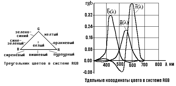 Колориметрическая система RGB(рис.5.1.)удобна для проведения экспериментальных исследований, т.к. ее основные цвета являются реально существующими, однако наличие отрицательных участков затрудняет создание измерительных приборов – колориметров. Кроме того, для определения яркости цвета необходимо знать величины всех трех основных потоков.