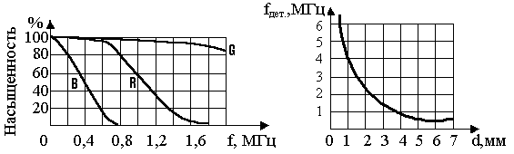 Человеческий глаз плохо воспринимает цвета мелких деталей. Связь между размерами детали и требующейся для ее передачи верхней границей полосы частоты, показана на рис. Многочисленные опыты показали, что с уменьшением размеров деталей их видимая цветовая насыщенность становится меньше, причем для разных цветов эти размеры различны. Подобное явление потери цветового зрения связано с различной спектральной чувствительностью глаза (наибольшая для зеленого цвета, средняя для красного и малая для синего). Зависимость этой потери приведена на рис. 5.5.