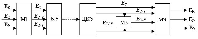 С выхода кодирующего устройства ПЦТВС через канал связи поступает на декодирующее устройства телевизора, где производится обратная операция выделения из общего спектра яркостного сигнала цветовых поднесущих частот, их детектирования для получения двух цветоразностных сигналов с помощью которых в матрице М2 формируется третий цветоразностный сигнал G-Y. Затем при помощи матрицы М3 из яркостного и 3 цветоразностных сигналов формируются исходные RGB сигналы.