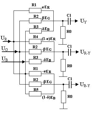 При наличии сигнала яркости нет необходимости передавать по каналу связи сигналы трех основных цветов. Достаточно передавать два из них, а третий можно будет получить в декодирующей матрице, вычитая их из яркостного.