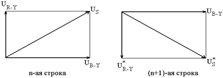 с началом каждой следующей строки меняет фазу на 180°. Результирующие векторы сигнала цветности
