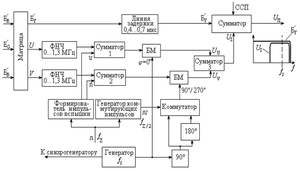 Квадратурные составляющие U U и U V, складываясь в сумматоре 3, образуют сигнал цветности US, который вместе с сигналами яркости и синхронизации приёмника представляет собой полный цветовой (композитный) сигнал U V. Линия задержки в тракте яркостного сигнала имеет то же назначение, что и системах NTSC и SECAM.